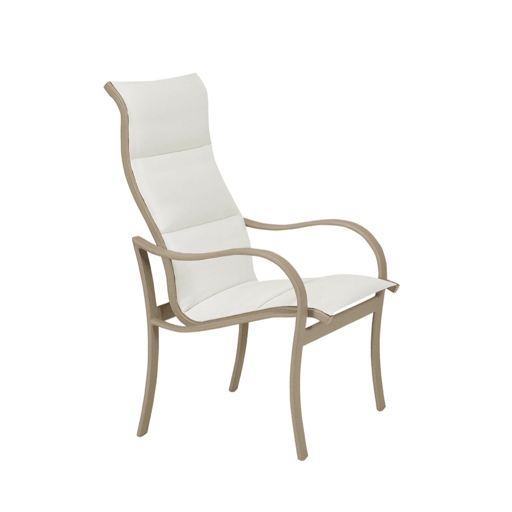 Inspired by the graceful curves of the beach, the Shoreline Padded Sling High Back Dining Chair boasts graceful arm supports and a sturdy well-crafted aluminum frame, which offers durability and ergonomic support. The ergonomically designed high back of the dining chair adds another level of comfort to any outdoor dining experience. The Shoreline Padded Sling Dining Chair features designer fabrics with padding for full-body comfort. Pair this classic outdoor patio chair with a Tropitone® Dining Table for your own private seaside escape.